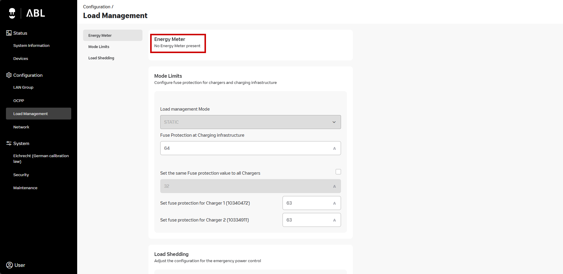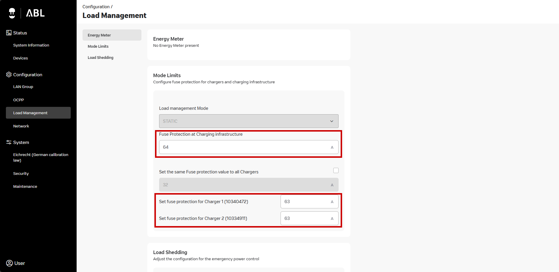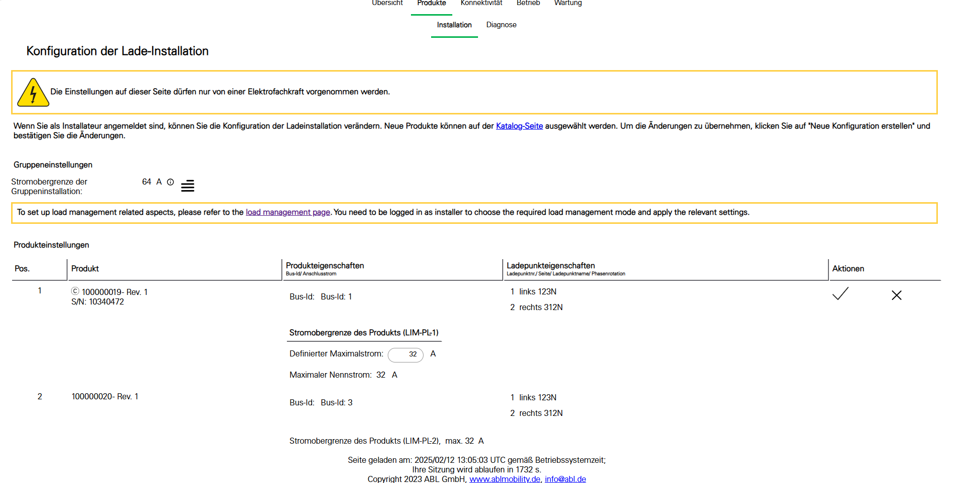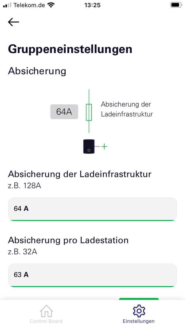 Der im Lastmanagement konfigurierte Max. Ladestrom sollte dem in der Ladestation konfigurierten max. Ladestrom entsprechen. Der Max. Ladestrom im Lastmanagement muss immer kleiner gleich dem max. Ladestrom in der Ladestation sein, da es sonst in der Ladestation zu Fehlern kommen kann.