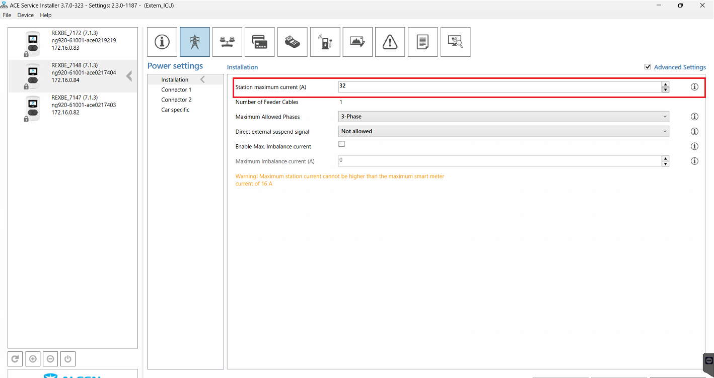 Als Max. Ladestrom muss der Wert eingestellt werden, mit dem die Ladestation elektrisch angeschlossen ist (Auslegung elektrische Zuleitung und Konfiguration in der Ladestation beachten!). Der Standardwert entspricht 16A pro Phase. Die Ladestation hat eine maximale Ladeleistung von 16A. Normalerweise muss nichts angepasst werden.