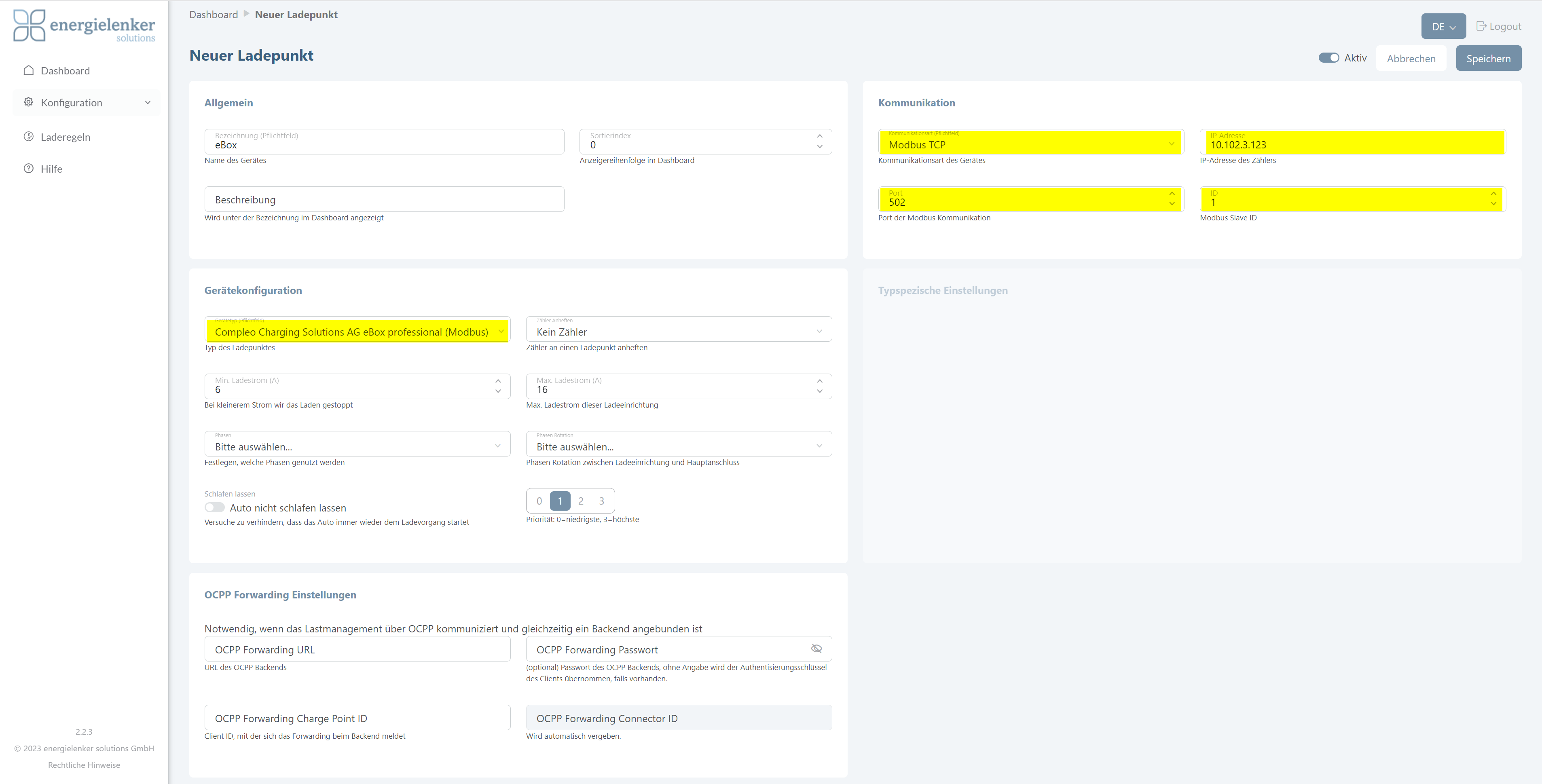 - Die OCPP ChargeBoxIdentity (ChargepointID) kann nach Belieben angepasst werden, diese muss später im energielenker System angegeben werden.