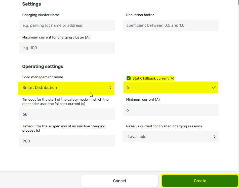 - Unter Create Charging Cluster den Load management mode auf Smart Distribution stellen.