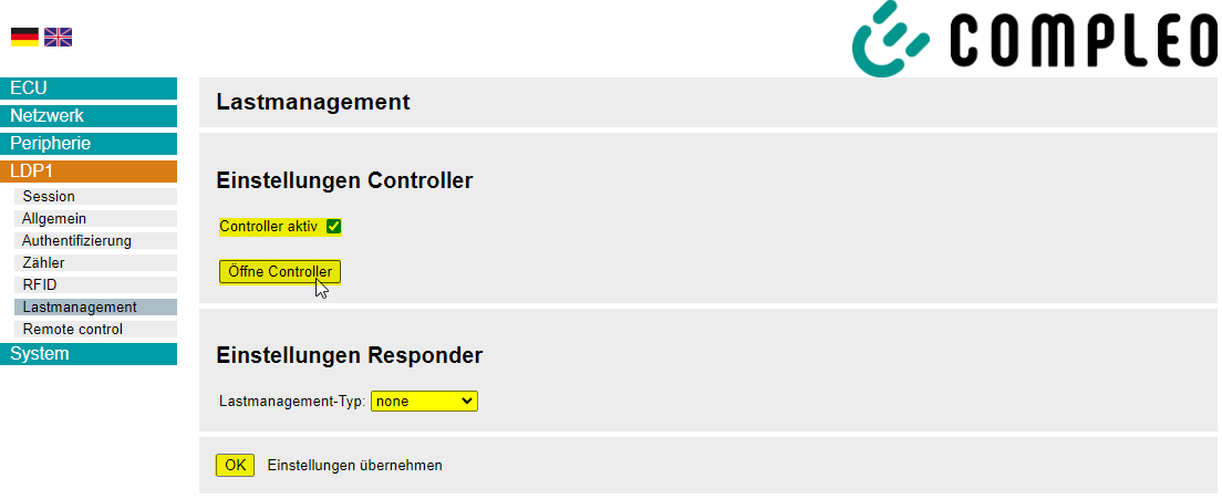- Unter Einstellungen Responder den Lastmanagement-Typ auf none stellen.