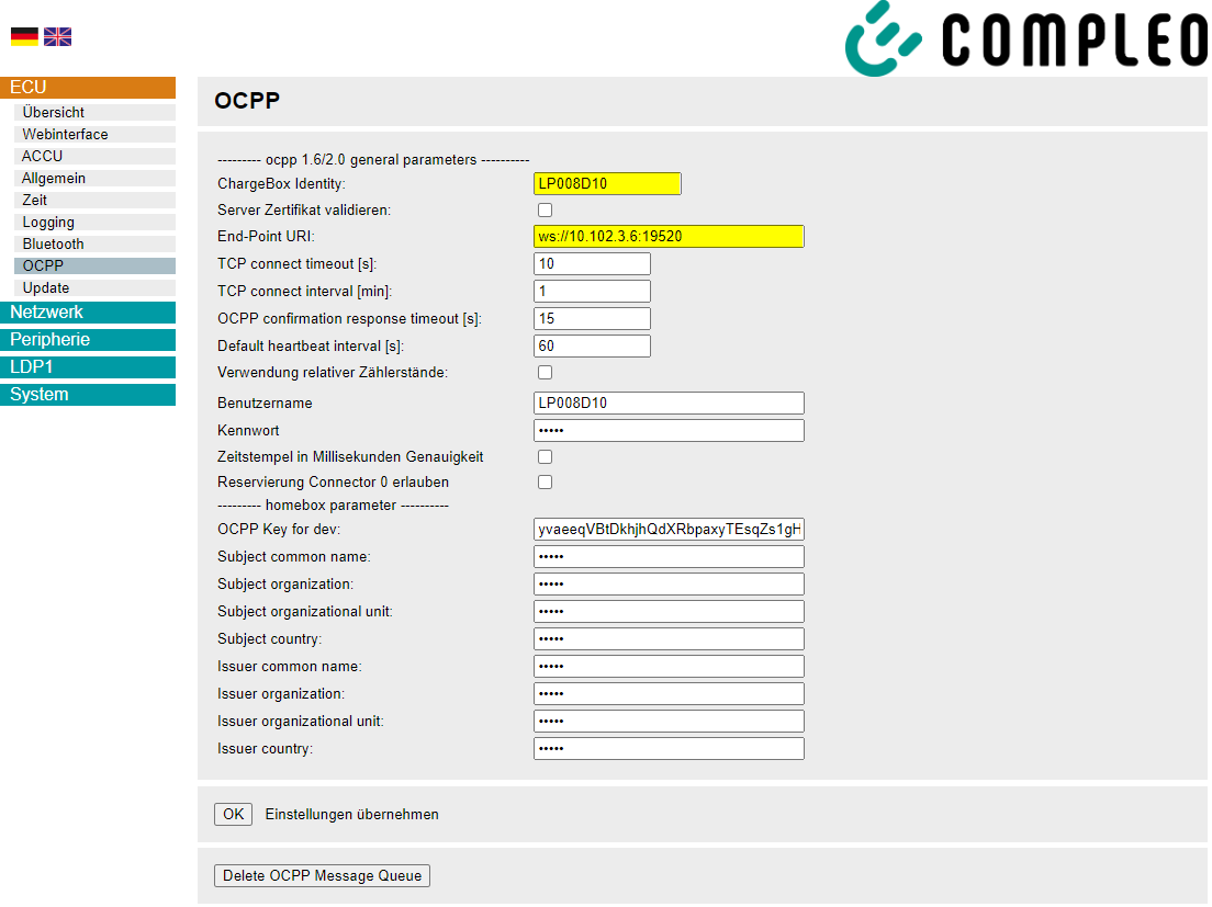 - Im Web-UI der eBox unter ECU → OCPP navigieren.