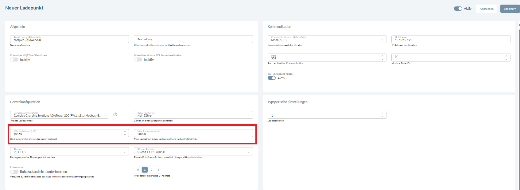 - Im Feld Phasen muss L1, L2 ,L3 eingetragen werden, da DC-Ladepunkte alle drei Phasen Verteilernetz-seitig gleich belasten.