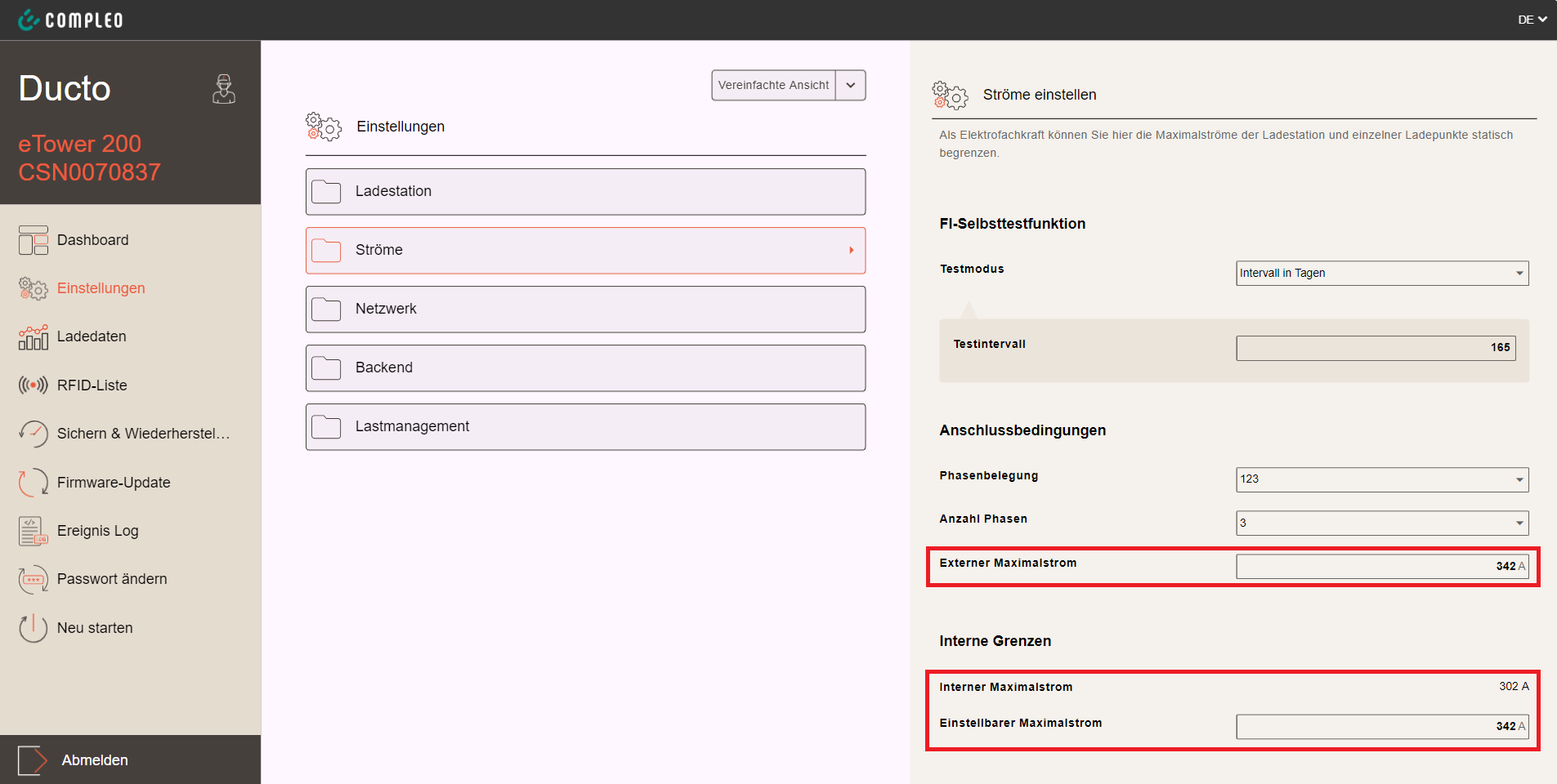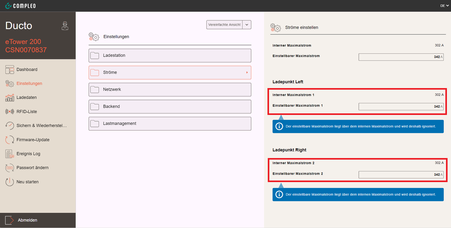 Der im Lastmanagement zu konfigurierende Max. Ladestrom muss AC-seitig einphasig umgerechnet angegeben werden.