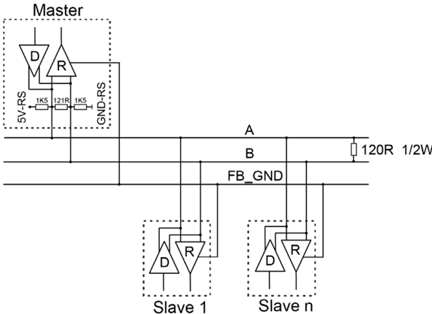 - Die Kommunikation erfolgt über einen linienförmigen RS485‑Bus.
